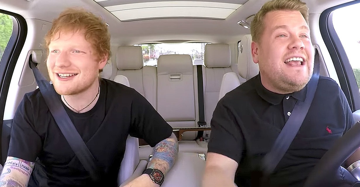 Na noite desta terça (6), foi ao ar o “Carpool Karaoke” que o James Corden gravou com o Ed Sheeran e o quadro veio cheio de hits, dois deles de outros intérpretes… Juntos, o ruivinho e o ursinho cantaram a ótima “Love Yourself” (co-escrita por Ed, mas gravada por Justin Bieber) e o hit “What Made You Beautiful”, do One Direction! Maravilhoso, né?! Do repertório de Sheeran ainda vieram: “Shape of You”; “Sing”, “Thinking Out Loud” e “Castle on the Hill”.