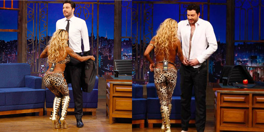 Inês Brasil desafia e Danilo Gentili fica peladão com ela no palco; assista